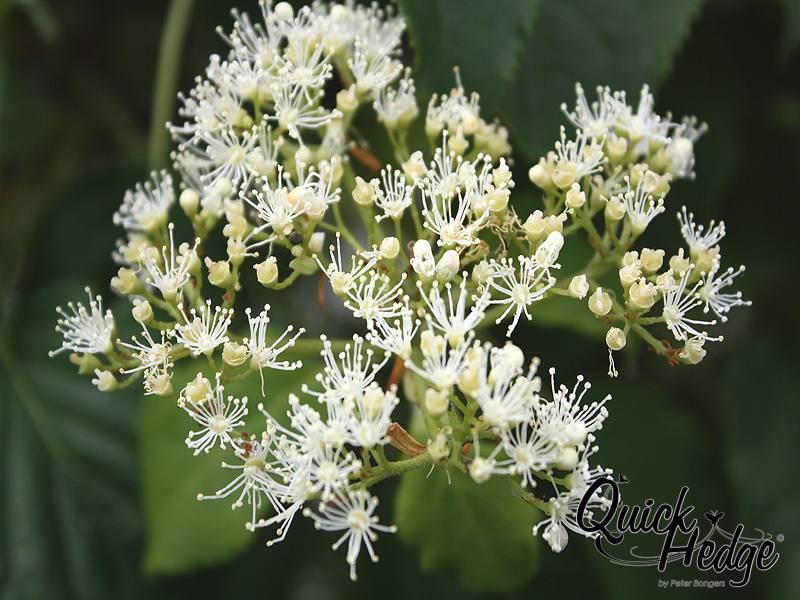 Sommer, flache bis kuppelförmige große Schirmrispen, aus weißen fertilen und sterilen Blüten