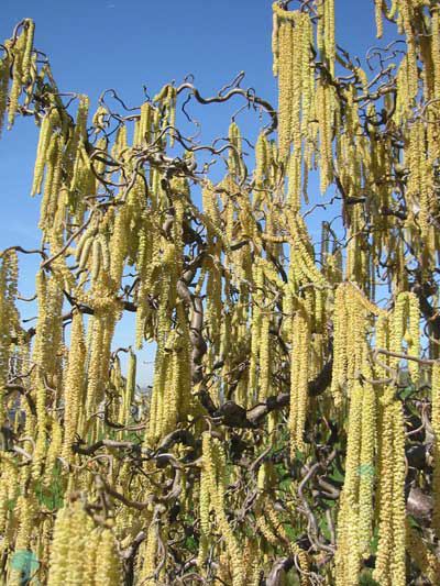 Korkenzieherhaselnuß 2-4m, Blatt gerollt, Blüte: gelbgrüne Kätzchen, III-IV, korkenzieherartig gedrehte Triebe, Wildtriebe sofort entfernen, Solitärpflanze.