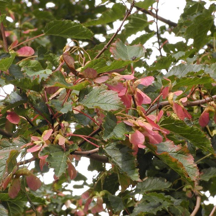 Früchte: Fruchtflügel meist parallel stehend, rötlich leuchtend.