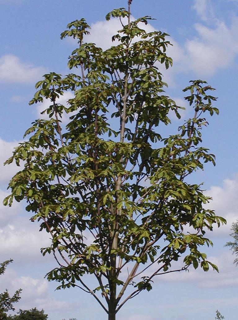 Grosser Baum mit schmal kegelförmiger Krone. Später breiter wachsend. Höhe 10-15 m. Langsam wachsend. Grosses, glänzend dunkelgrünes Laub. Früh im Austrieb. Aufrechte Dolden mit weissen Blüten im Mai. Für grosse Gärten.