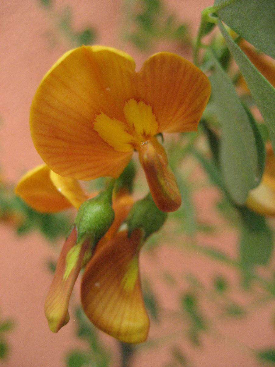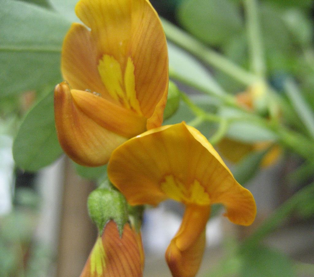 Blüte/Frucht: Oranger Blasenstrauch, braun-getuschte Schmetterlingsblüten in Trauben
