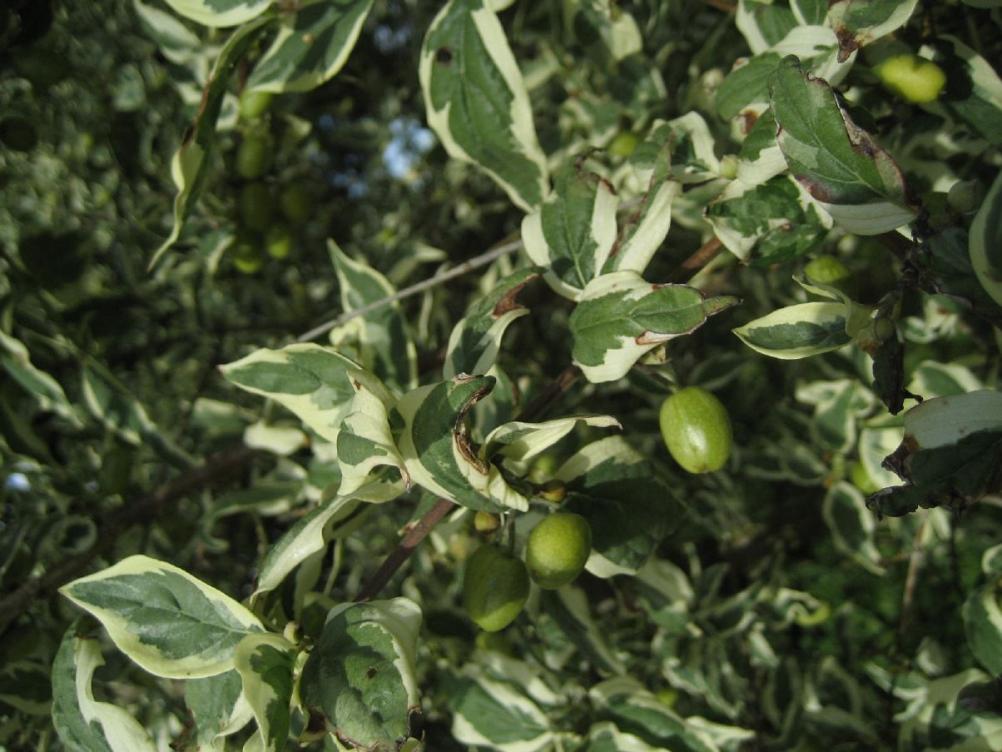 Zierend ist der Strauch auch durch die Füchte und die glänzend grünen Blätter, die sich im Herbst gelb bis rotorange färben.