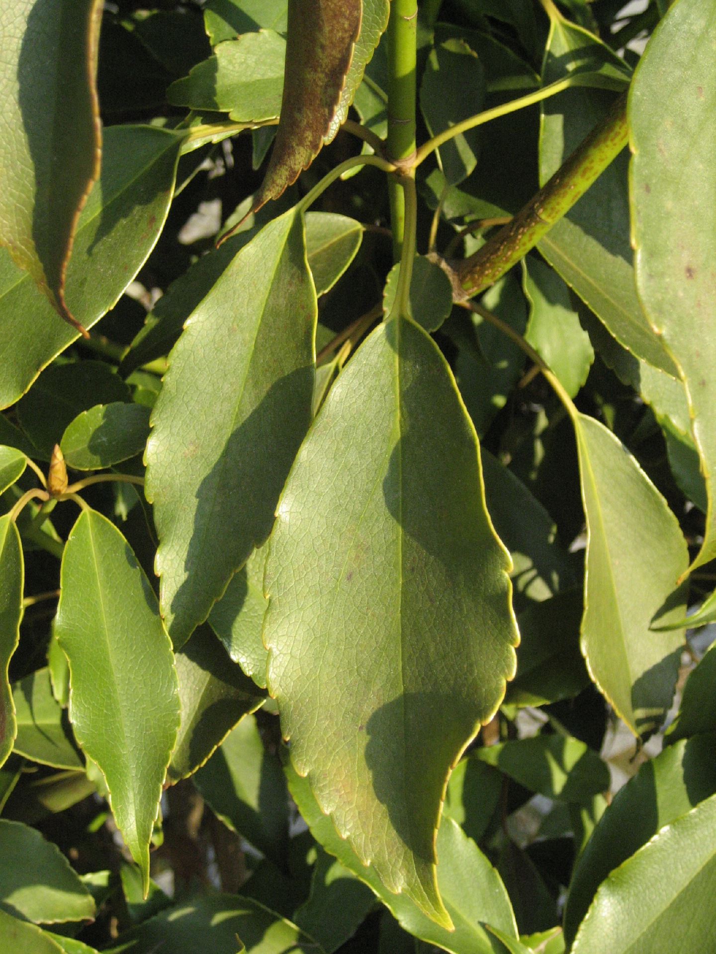 Mässig hoher Strauch mit aufrechtem Wuchs. Höhe ungefähr 2-3 m. Immergrün. Laub glänzend dunkelgrün. Im Frühjahr gelbgrüne Blüten in kleinen Dolden. Für nährstoffreiche, leicht saure Böden. Geschüt...