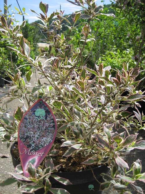 Beschreibung : kompakte Strauch, Die dunkelgrünen Blätter weisen eine rosaweisse, unterschiedlich breite Umrandung auf,