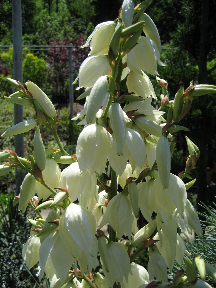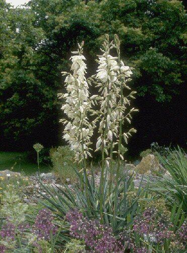Dekorative, immergrüne Einzelpflanze mit schwertförmigem Blatt. Bildet grosse, gut 1 m hoch werdende Büschel. Perlweisse Blüten an hohen, bis gut 1,5 m hoch werdenden Blütenstielen. Juli-August. Kalkliebend. Geschützter Standort.
