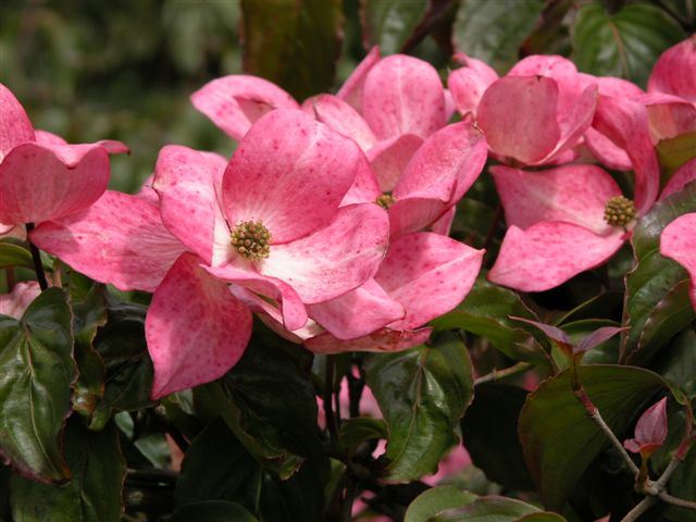Grossstrauch oder kleiner Baum. Höhe 4-6 m. Krone zuerst aufrecht, später rund wachsend. Dunkelgrünes Blatt. Im Herbst dunkelpurpurrot. Blüten von 4 grossen, rosaroten Hochblättern umgeben. Mai-Juni. Rote essbare Früchte im Herbst. Cornus kousa 'Satomi' benötigt einen geschützten Platz im Garten und nahrhaften, humosen Boden.
