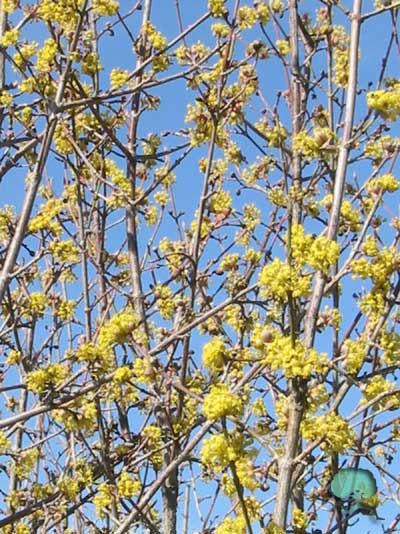 Blüten: Gelbe, kugelförmige Dolden, die vor dem Laubaustrieb oft schon Ende Februar erblühen.