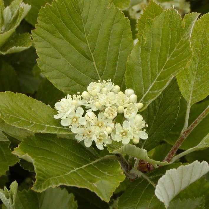 Sorbus aria, Echte Mehlbeere. In Europa und Nordafrika kommt die Echte Mehlbeere in lichten Eichen-Hainbuchenwälder, in Buchen- und Föhrenwälder oder im Saum von Gebüschen vor. Der bis 15m hohe B...