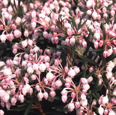 immergrüner und stark verzweigter Strauch. Höhe ca. 40 cm. Breite bis 60 cm. Blatt ist lederartig, länglich und glänzend grün. Kleine, hellrosa Blüten in Trauben. Mai - Juni. Geeignet für einen nicht zu trockenen, leicht saueren Standort.