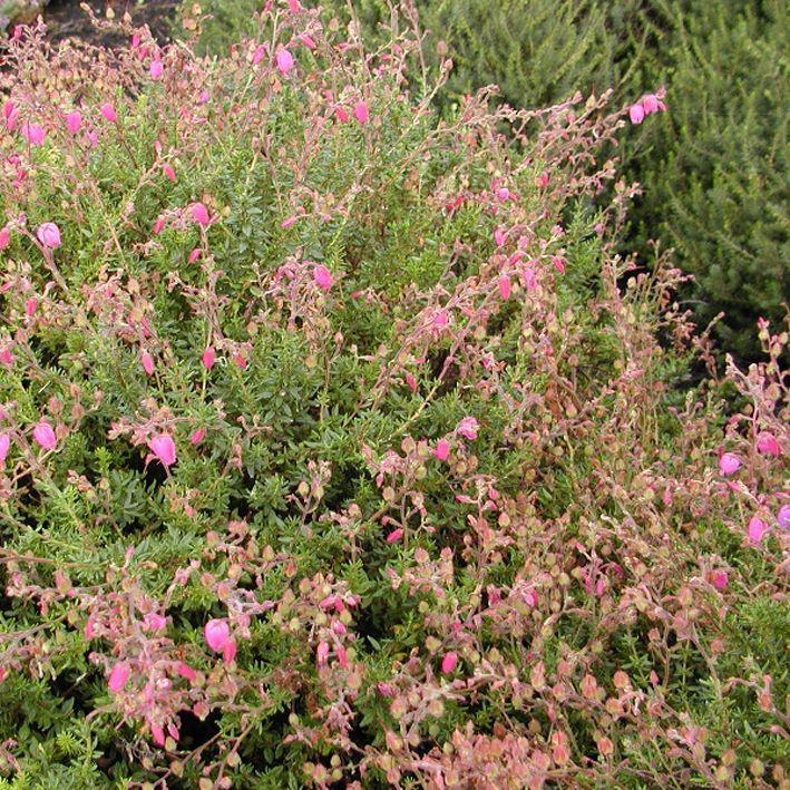 immergrüner Zwergstrauch mit lockeren, endständigen rosa Trauben, Blüte von Juli bis September; Pflanzbedarf / m2 bis 5 bis 7 Stück