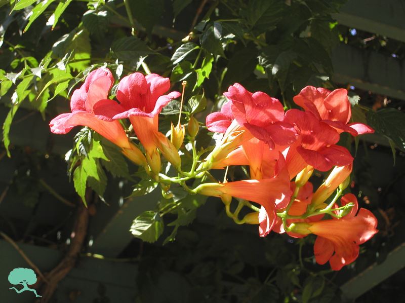 7-9m, Blüte: orangerot, Juni-Sepembert, Blüte bereits an jungen Pflanzen, Kletterhilfe nötig, warme gschützte Lage, tiefgründiger humoser Boden.