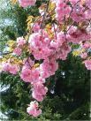 Japanische Blütenkirsche Rinde rotbraun, später braungrau, rissig, Laub spitzelliptisch, bis 10 cm, im Austrieb braunrot, später glänzend grün, Blüte dunkelrosa, dicht gefüllt