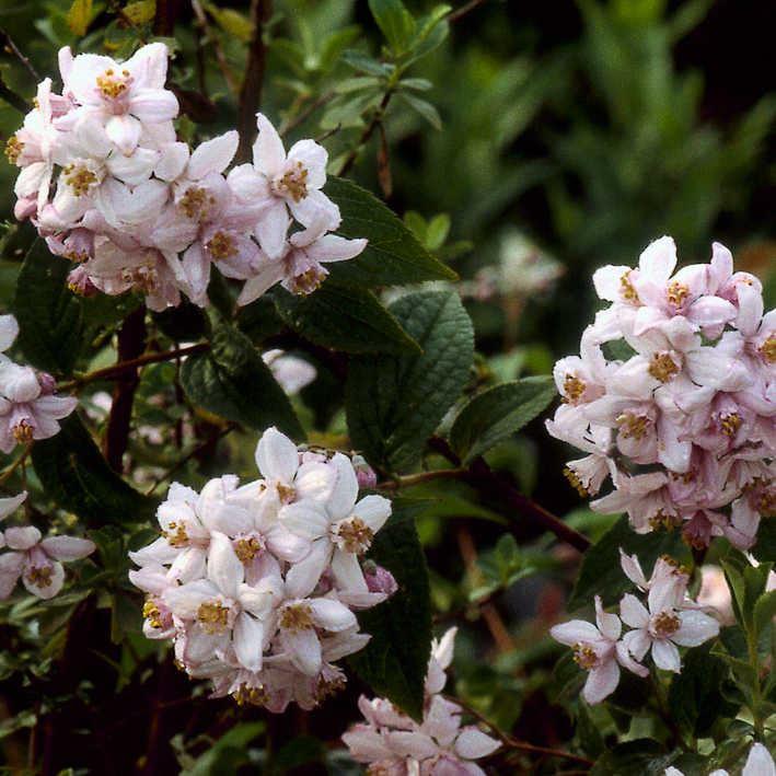 Buschiger sommergrüner Strauch bis ca. 2 m hoch. Kleines grünes Laub. Hellrosa Blütentrauben. Mai und Juni. Reichblühend. Vollsonnige Standorte, nährstoffreiche Böden. Regelmässig altes Holz herausschneiden.